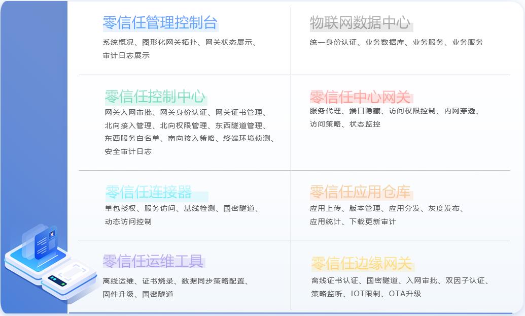 平臺由邊緣網關代理程序、網關離線運維工具、控制中心、接入網關、應用倉庫等模塊組合而成。產品核心功能包括邊緣網關身份認證、網關出入站訪問控制、網關間微隔離控制、邊緣應用管理、網關安全運維、網關數據存儲透明加解密等。同時平臺保護網關與北向數據中心的訪問安全,包括端口隱藏,通訊加密等。