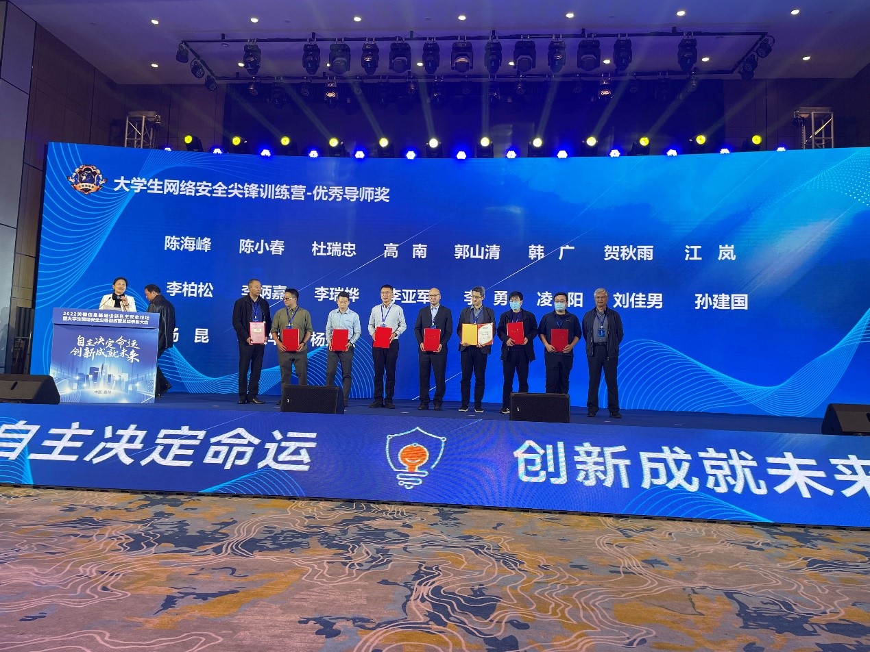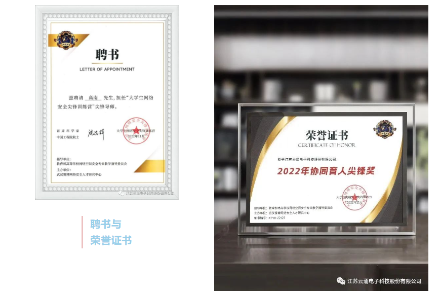 在大學生網絡安全尖鋒訓練營2022年度總結表彰儀式上,公司董事長高南先生榮獲優秀尖峰導師獎,云涌科技榮獲2022協同育人尖峰獎。